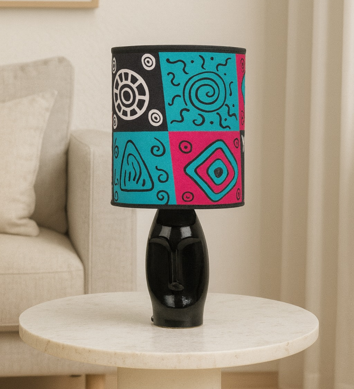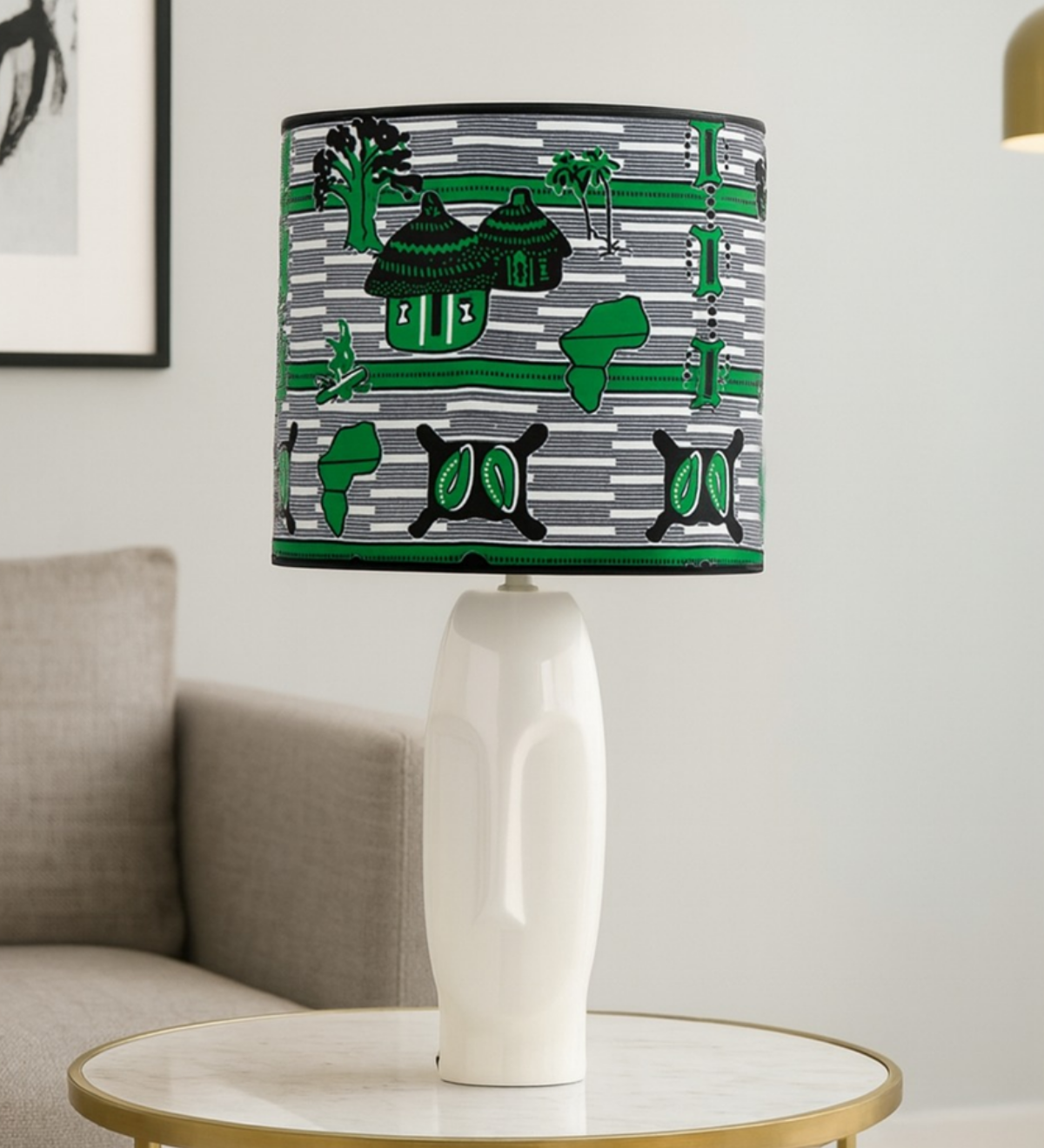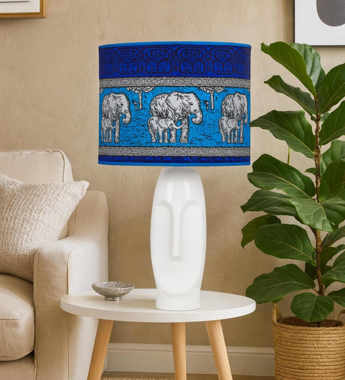 Tel une fresque de la savane, cet abat-jour célèbre la majesté des éléphants sous un ciel d’indigo. Les motifs tribaux dansent avec élégance, racontant des histoires de légendes anciennes. Sur son pied sculptural, il diffuse une lumière douce, capturant l’âme et la sagesse de l’Afrique.