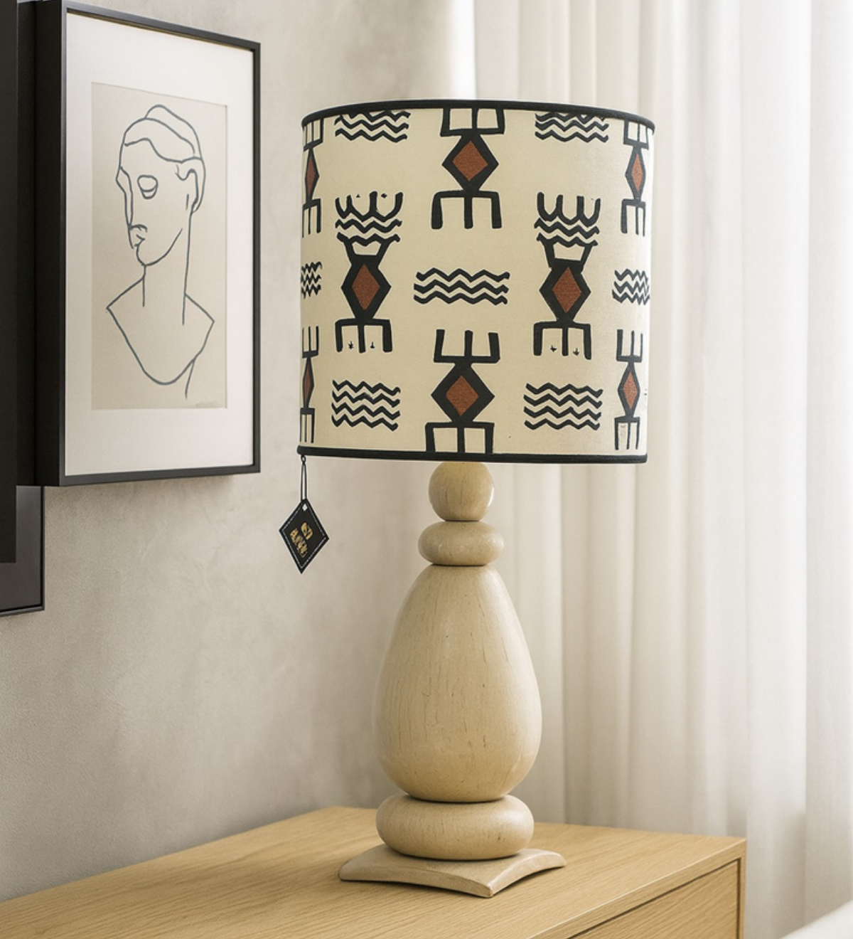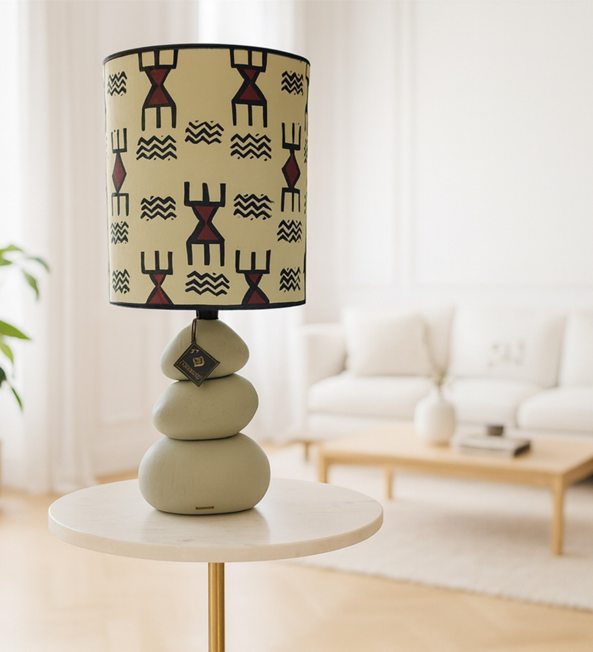 Telle une lanterne magique, cet abat-jour captive le regard par son mélange subtil de formes géométriques et de teintes chaudes. Ses motifs colorés, évoquant les riches tapis berbères, irradient d’une lumière douce et enveloppante, invitant à un voyage sensoriel au cœur des traditions africaines. Le pied, sculpté avec finesse, semble porter les traces du temps, insufflant à l’ensemble une aura d’authenticité et de sagesse ancestrale.