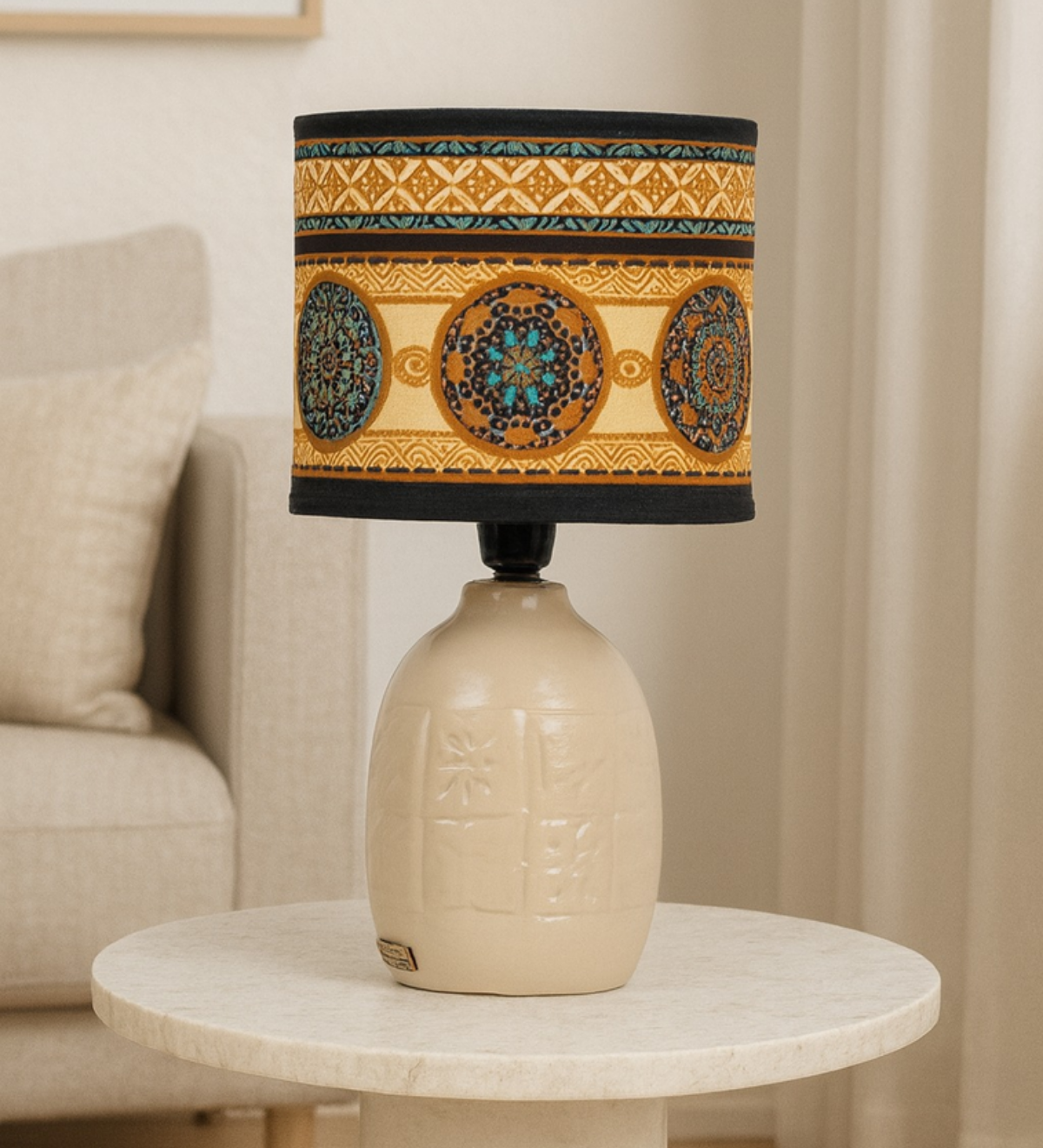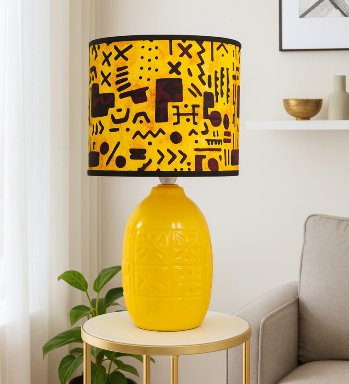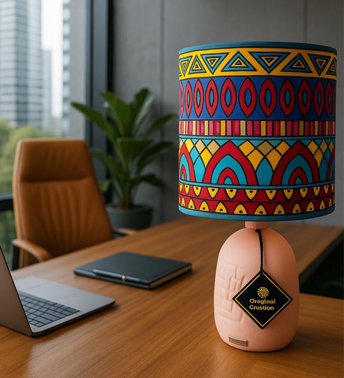 Tel un feu de brousse illuminant la nuit, cet abat-jour captive par ses motifs organiques et ses couleurs brûlantes. Ses formes sinueuses, évoquant les paysages africains, répandent une lumière chaleureuse et apaisante, invitant à un voyage au cœur de la nature sauvage. Le pied, sculpté avec finesse, semble porter les traces d’une ancestrale sagesse, insufflant à l’ensemble une aura de noblesse et de spiritualité.