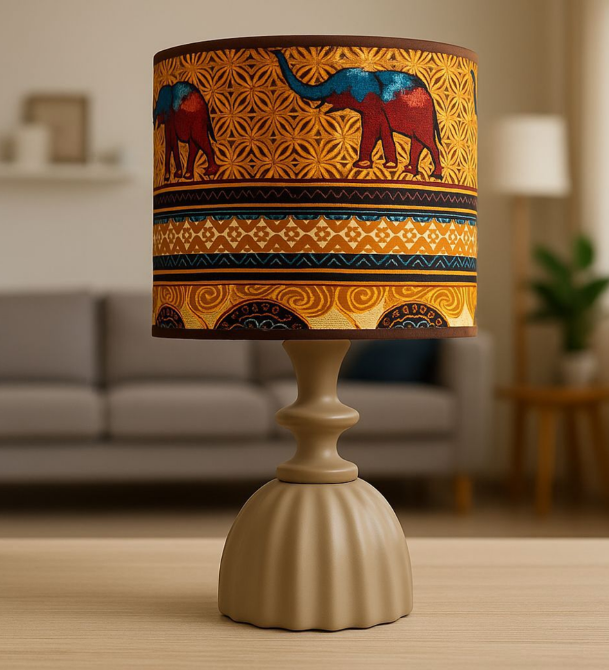 Tel un voyage en terre africaine, cet abat-jour aux motifs d’éléphants et de géométries dorées danse sous la lumière. Les teintes chaleureuses et les motifs tribaux chantent les récits des savanes infinies. Sur son socle élégant, il éclaire l’espace d’une aura mystique et intemporelle.