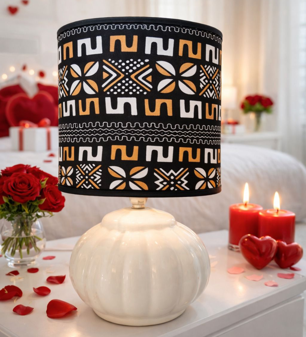 Discrète et lumineuse, la lampe Nyota incarne l’équilibre parfait entre modernité et héritage africain. Son abat-jour en tissu wax africain, travaillé dans des tons noirs, beige et blanc aux motifs géométriques et ethniques, diffuse une lumière douce et enveloppante qui crée une atmosphère apaisante et chaleureuse.