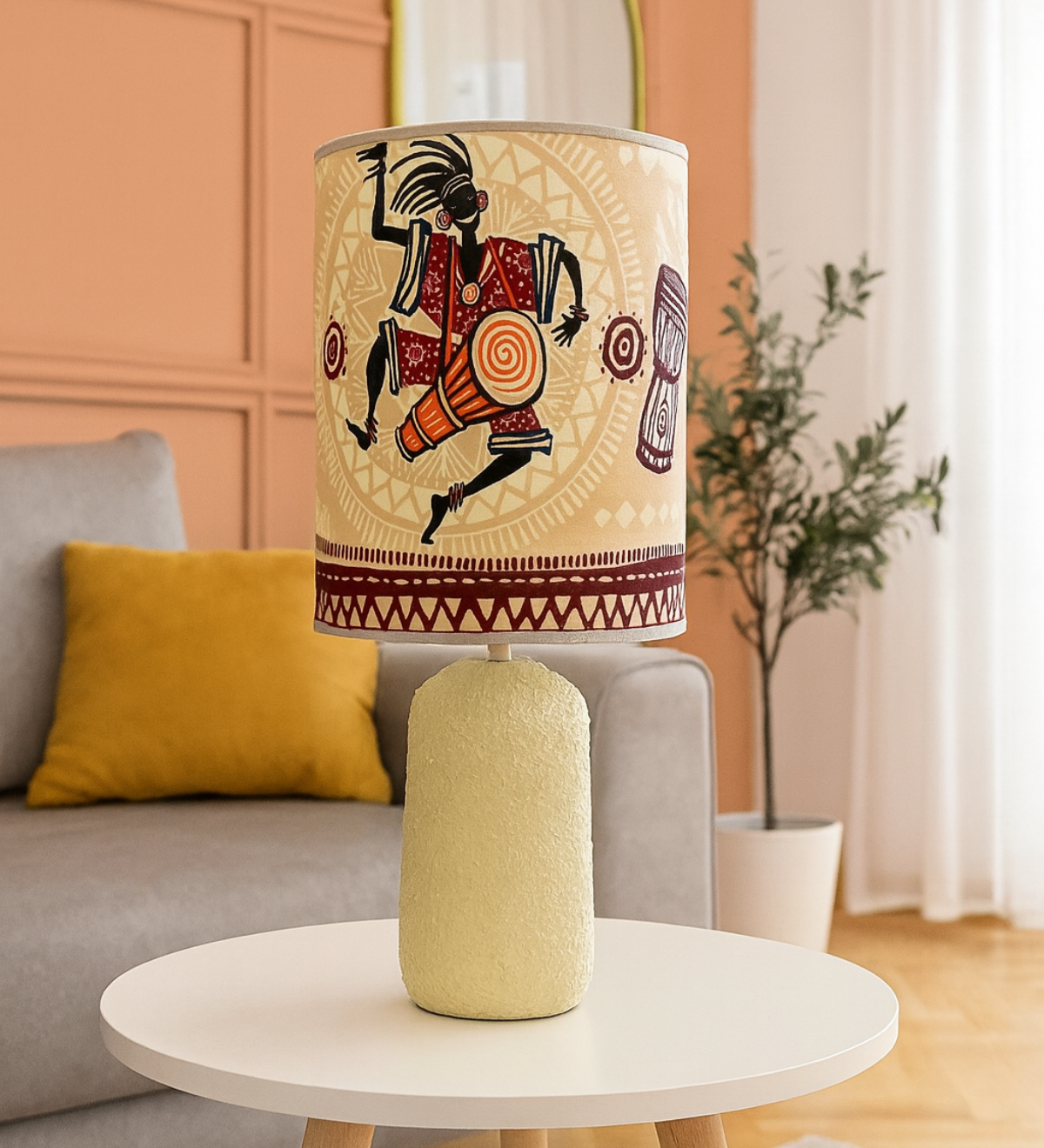 Chaleureux, authentique et résolument artistique, l’abat-jour Rita apporte à votre intérieur une touche d’âme et de caractère inspirée de l’Afrique. Son abat-jour en tissu wax africain met en scène des motifs traditionnels puissants — danseurs, tambours et symboles graphiques — dans une palette chaleureuse de beige, ocre, rouge et brun. La lumière qu’il diffuse est douce et enveloppante, créant une atmosphère conviviale et pleine de vie.