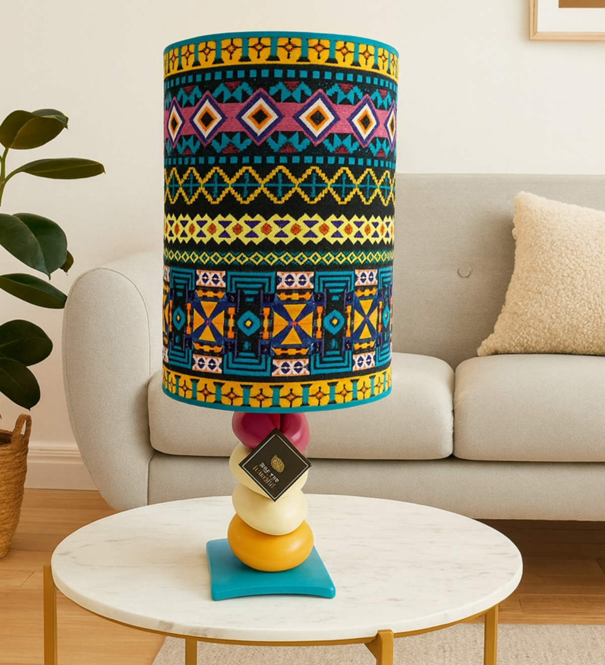 Tel un joyau africain, cet abat-jour captive par la richesse de ses motifs et la profondeur de ses couleurs. Ses formes entrelacées, rappelant les tissages traditionnels, diffusent une lumière chaleureuse et enveloppante, invitant à un voyage au cœur de l’artisanat ancestral. Le pied, sculpté avec finesse, semble porter les traces du temps, insufflant à l’ensemble une aura d’authenticité et de noblesse.